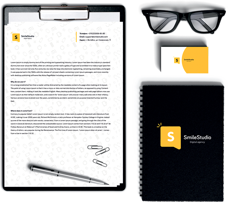Логотип "SmileStudio" состоит из знака и текстового блока. Идеология логотипа просто - это коммуникация с клиентами и в дальнейшем развитие доверия. Диалоговое окно указывает на коммуникабельность, а 3 полосы сверху на эмоции, которые развиваются в процессе работы. Простая задумка, но сколько она несет в себе смысла, не так ли?